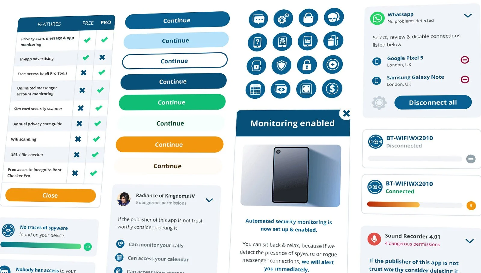 The company wanted to include monitoring for rogue messenger connections, dangerous apps/permissions & WIFI networks. These features would be available to all premium users or unlocked for x1 use via reward ads.