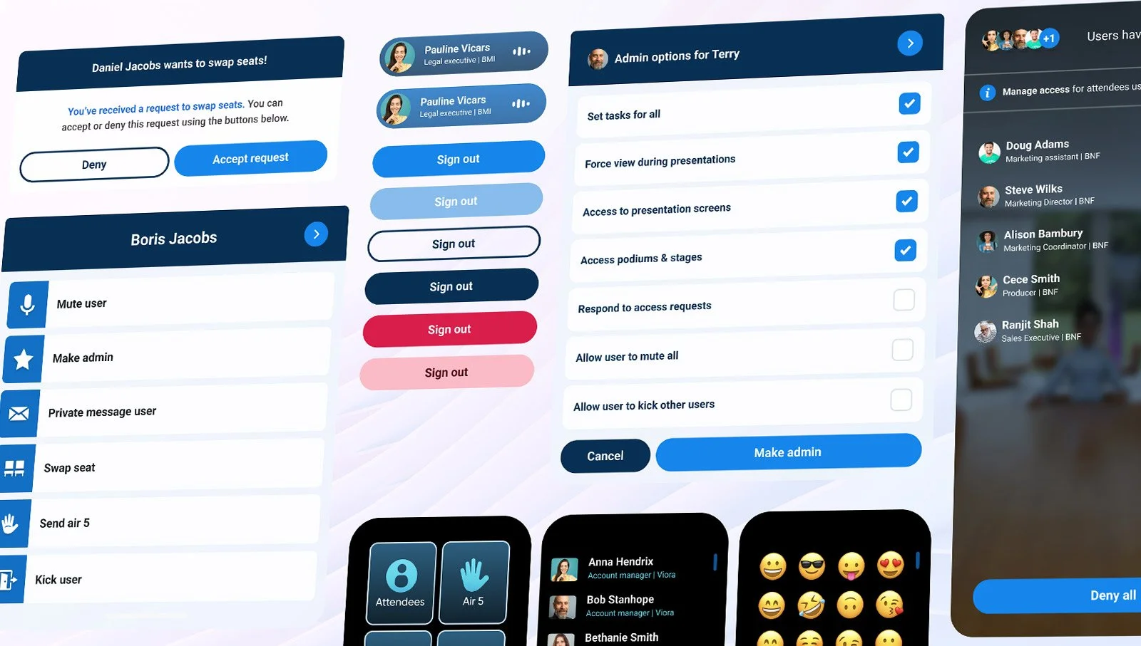 Maintaining a consistent experience for the user, from sign in to participating in a virtual meeting was key. Ensuring that Viora’s visual identity would translate over to virtual meetings was paramount, so the design system had to be flexible, covering multiple channels effectively.